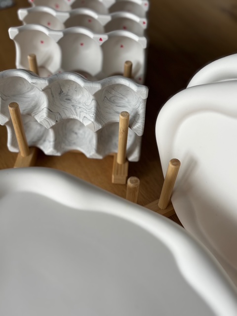 Fabriqués en Jesmonite, un matériau innovant à base d’eau, composé de poudre minérale -Gypse- et d’une résine acrylique.